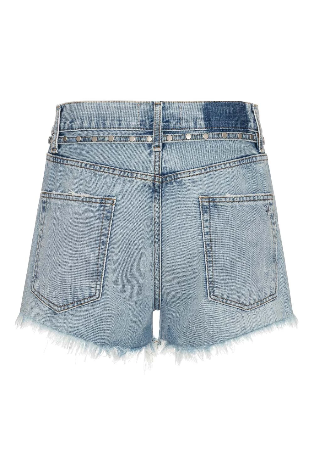 Short confeccionado em jeans. Cintura média, modelagem solta e comprimento médio. Cinto confeccionado no mesmo tecido com rebites foscos aplicados. Barra e detalhes dos bolsos desfiados.