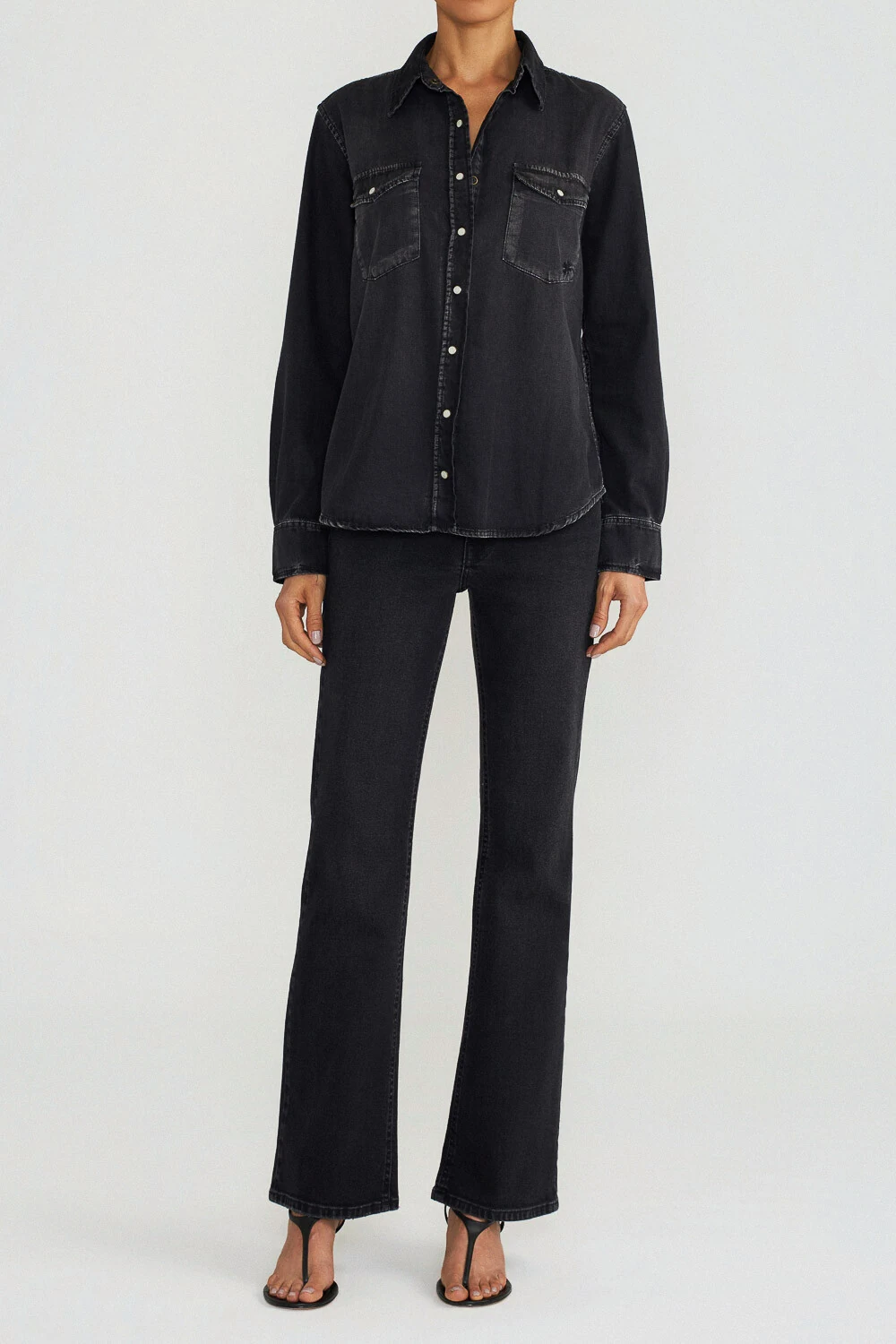 Camisa de black jeans, com modelagem solta e mangas longas. Possui gola e fechamento com botões de pressão, além de bolsos na parte frontal para funcionalidade e estilo adicionais.
