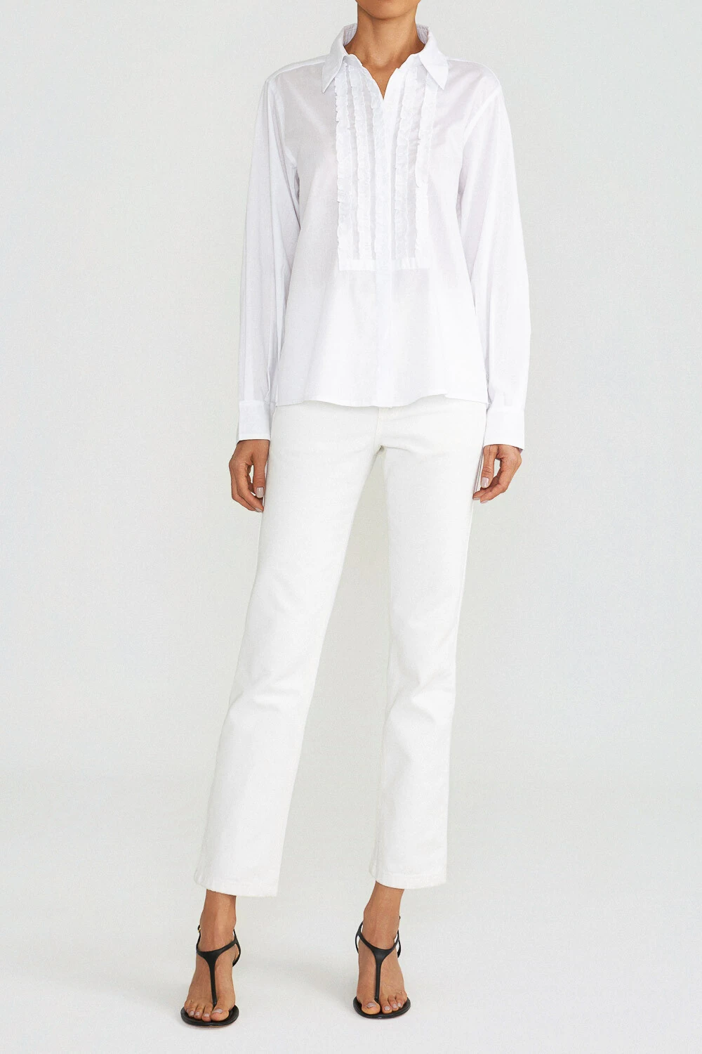 Confeccionada em cambraia de algodão, esta camisa une sofisticação e conforto com uma modelagem ampla e manga longa, garantindo caimento impecável. O detalhe icônico são os babados frontais no estilo smoking, que adicionam um toque de elegância e dramaticidade à peça, perfeita para looks formais com um ar contemporâneo. Ideal para eventos especiais ou para quem deseja destacar-se com um estilo cheio de personalidade.