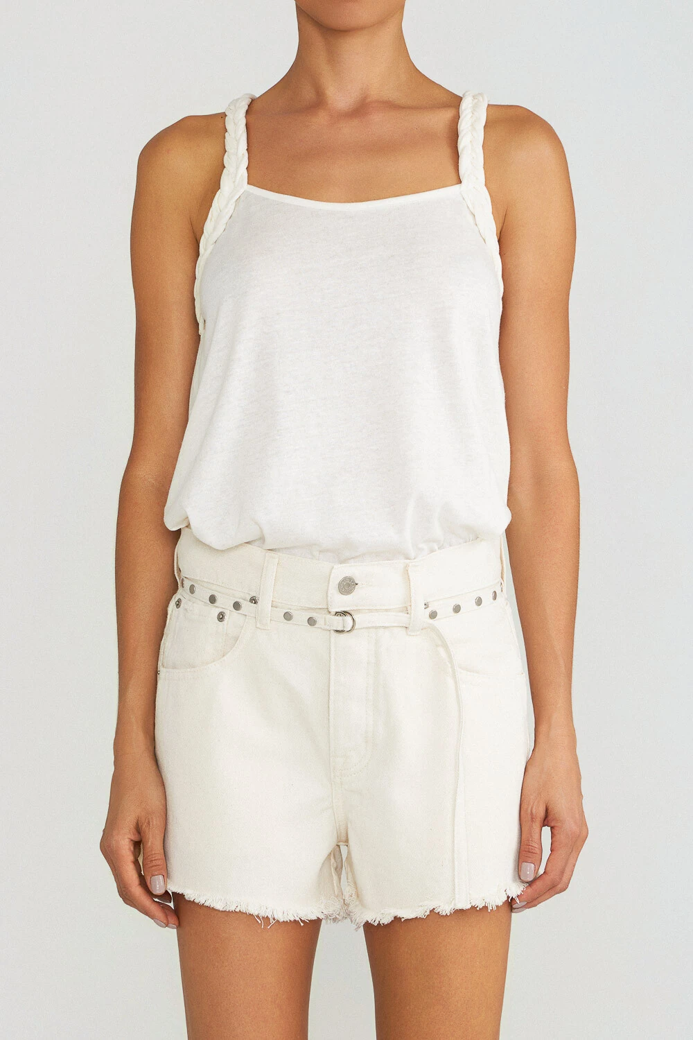 Regata em malha de linho, leve, fluida e respirável, com detalhe trançado que adiciona textura e charme. Caimento natural que une conforto em uma peça versátil.