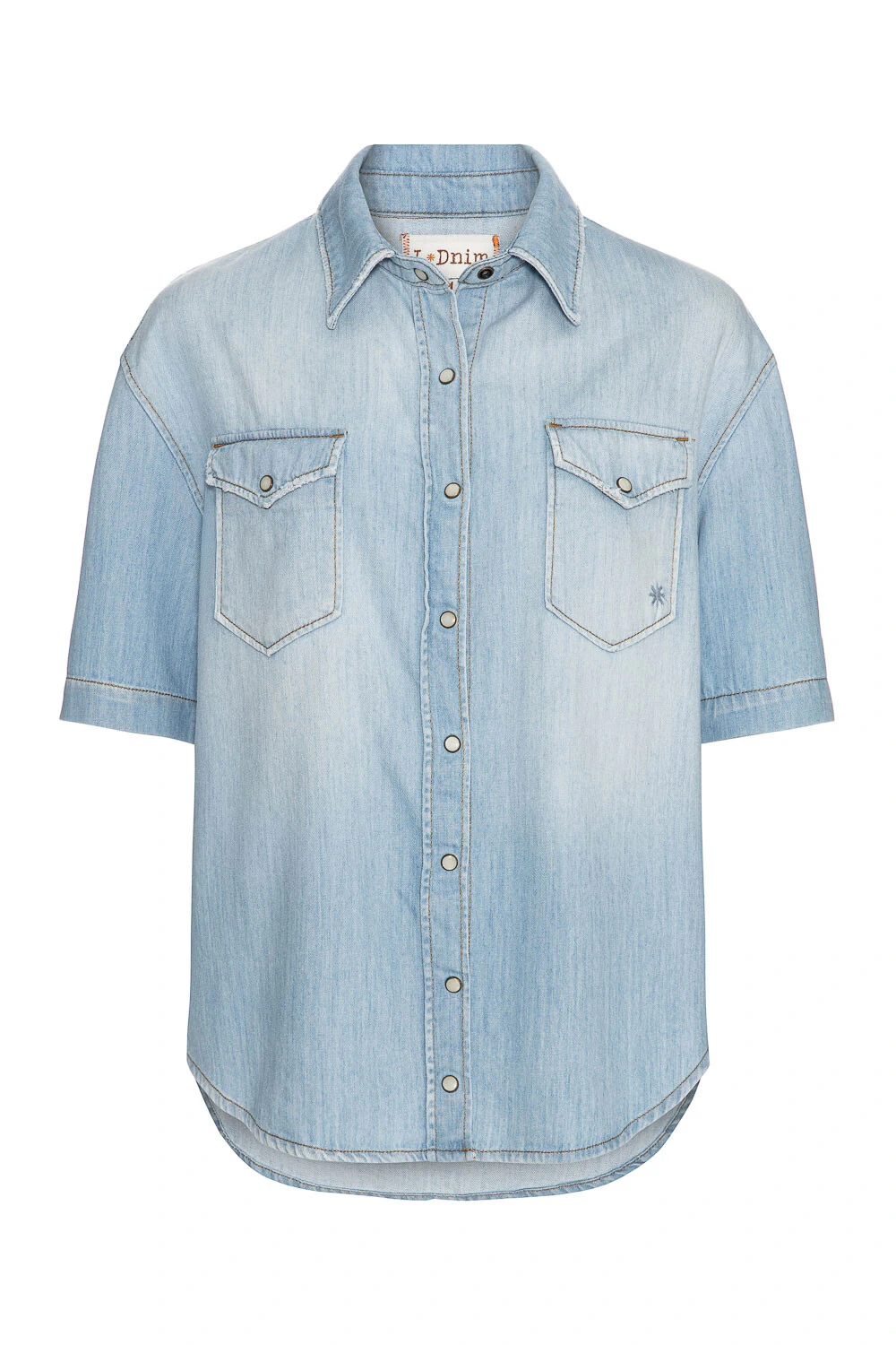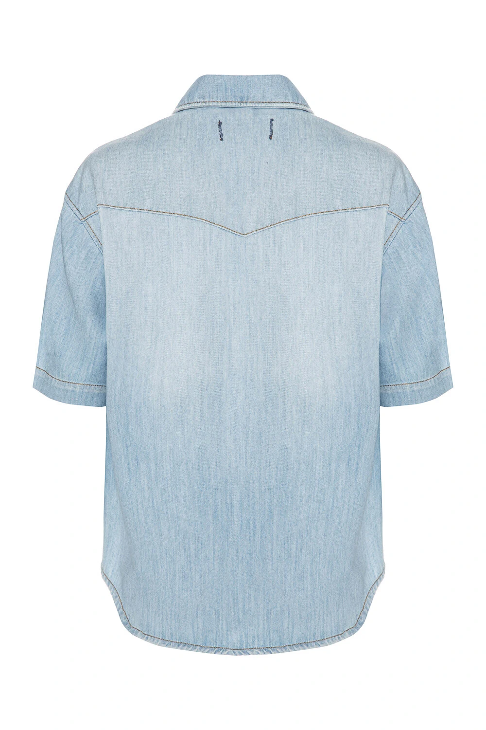Camisa jeans vintage de manga curta, 100% algodão. Modelagem leve e versátil, com fechamento em botões de pressão e bolsos simetricos na frente perfeita para composições fresh e confortáveis.