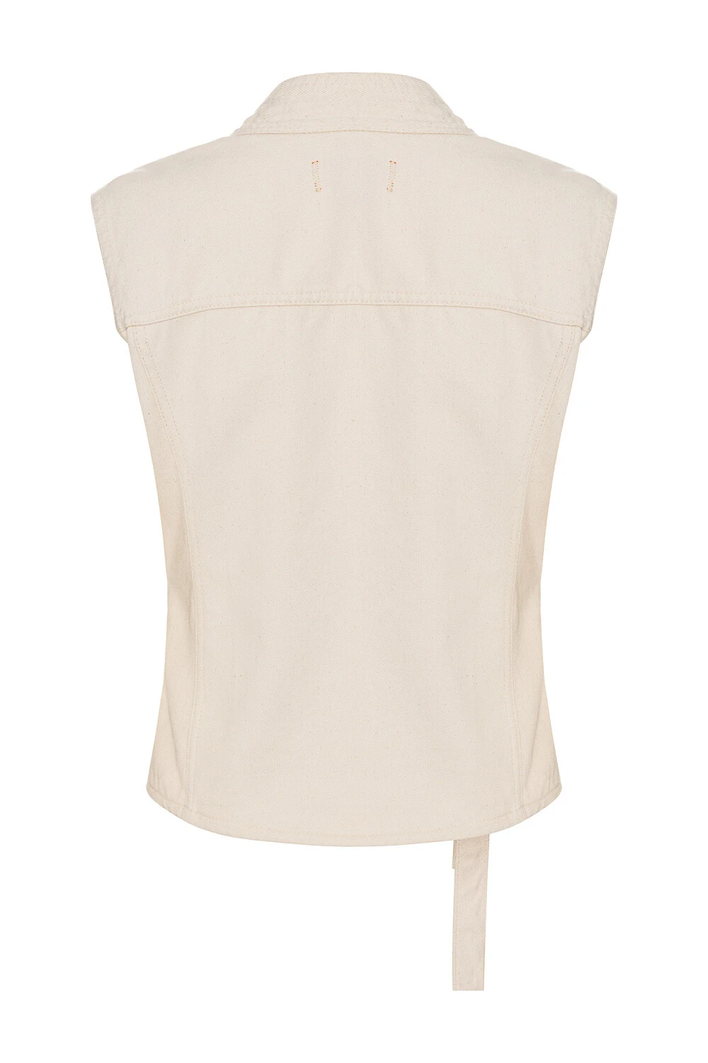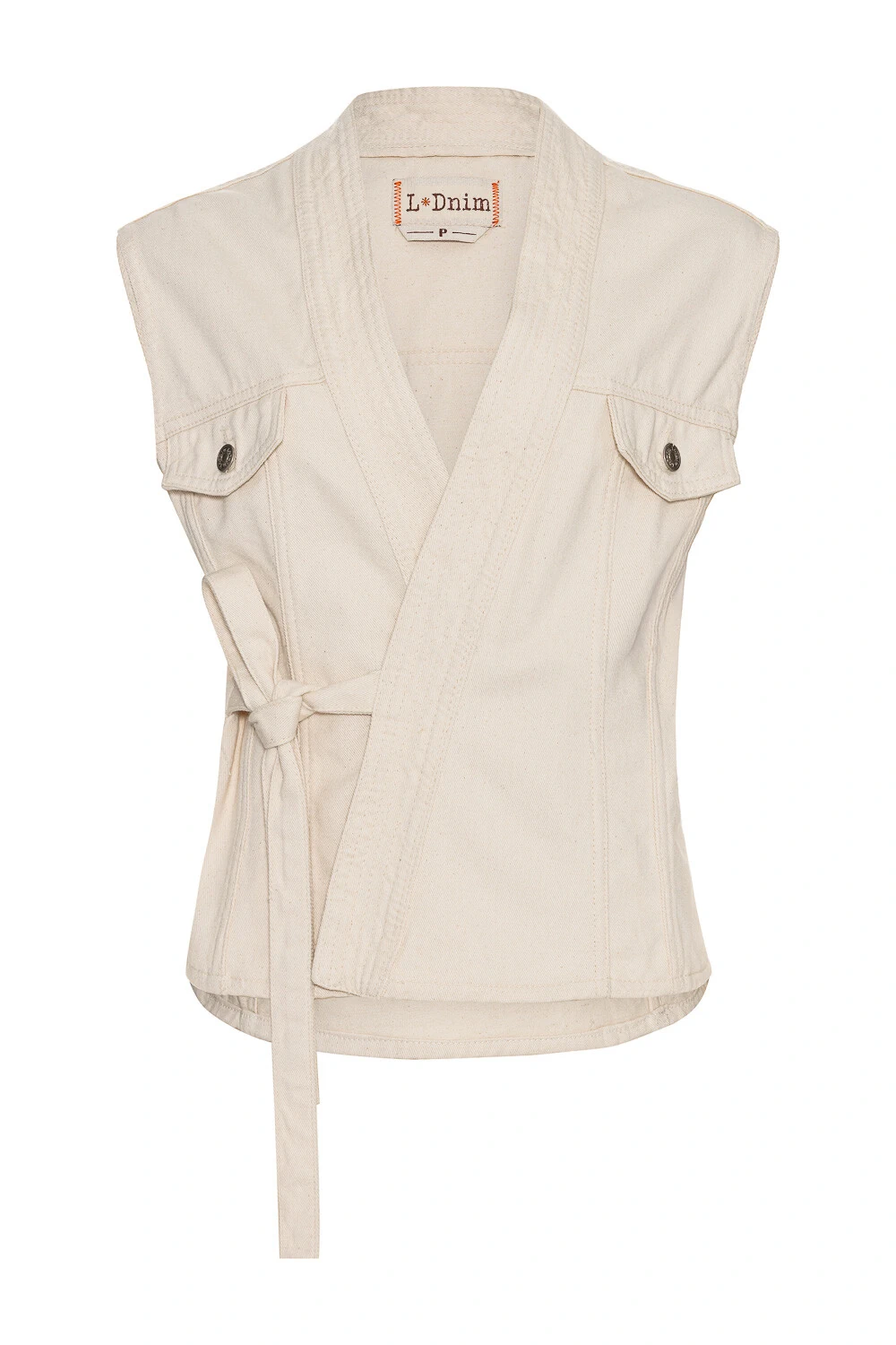 Colete Kimono Natural Denim em sarja 100% algodão, estruturado e de caimento preciso. Dois bolsos frontais e amarração na cintura em um design que adiciona atitude ao look.