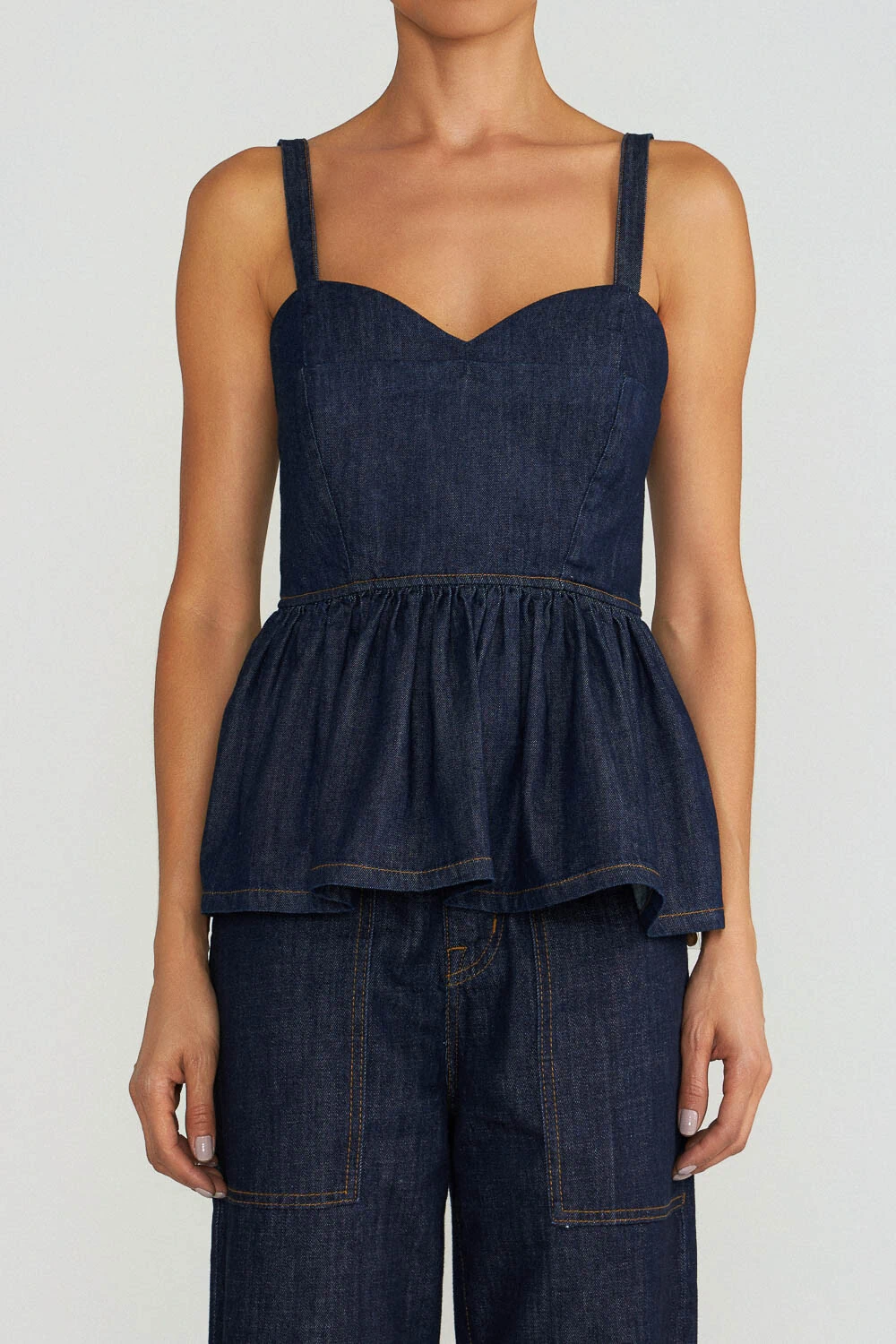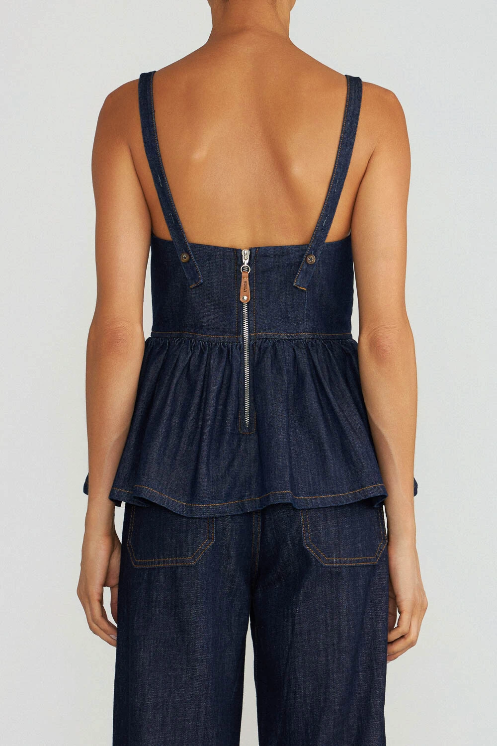 Confeccionado em jeans, este top oferece um caimento perfeitamente ajustado ao corpo. Modelagem justa até a cintura com detalhe de peplum. As alças contam com três regulagens em botão, permitindo um ajuste personalizado para maior conforto. Detalhe de dobra no busto traz estrutura complementando o estilo. O fechamento é feito por zíper nas costas, acompanhado de um puxador em couro que deve ser removido antes da lavagem para preservar o acabamento do mesmo. O cursor do zíper foi pensado para facilitar a retirada do puxador, garantindo praticidade na hora de cuidar da peça.