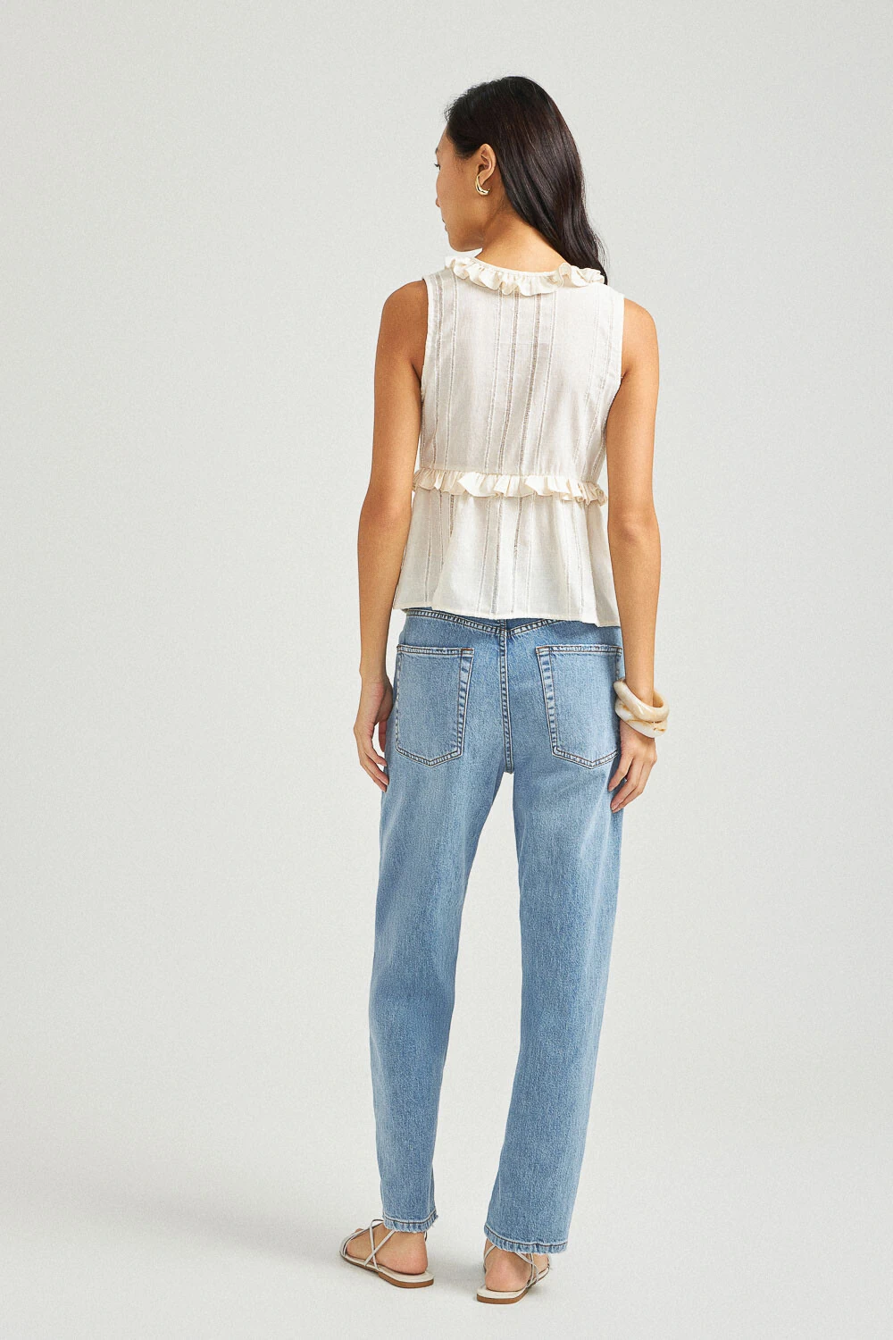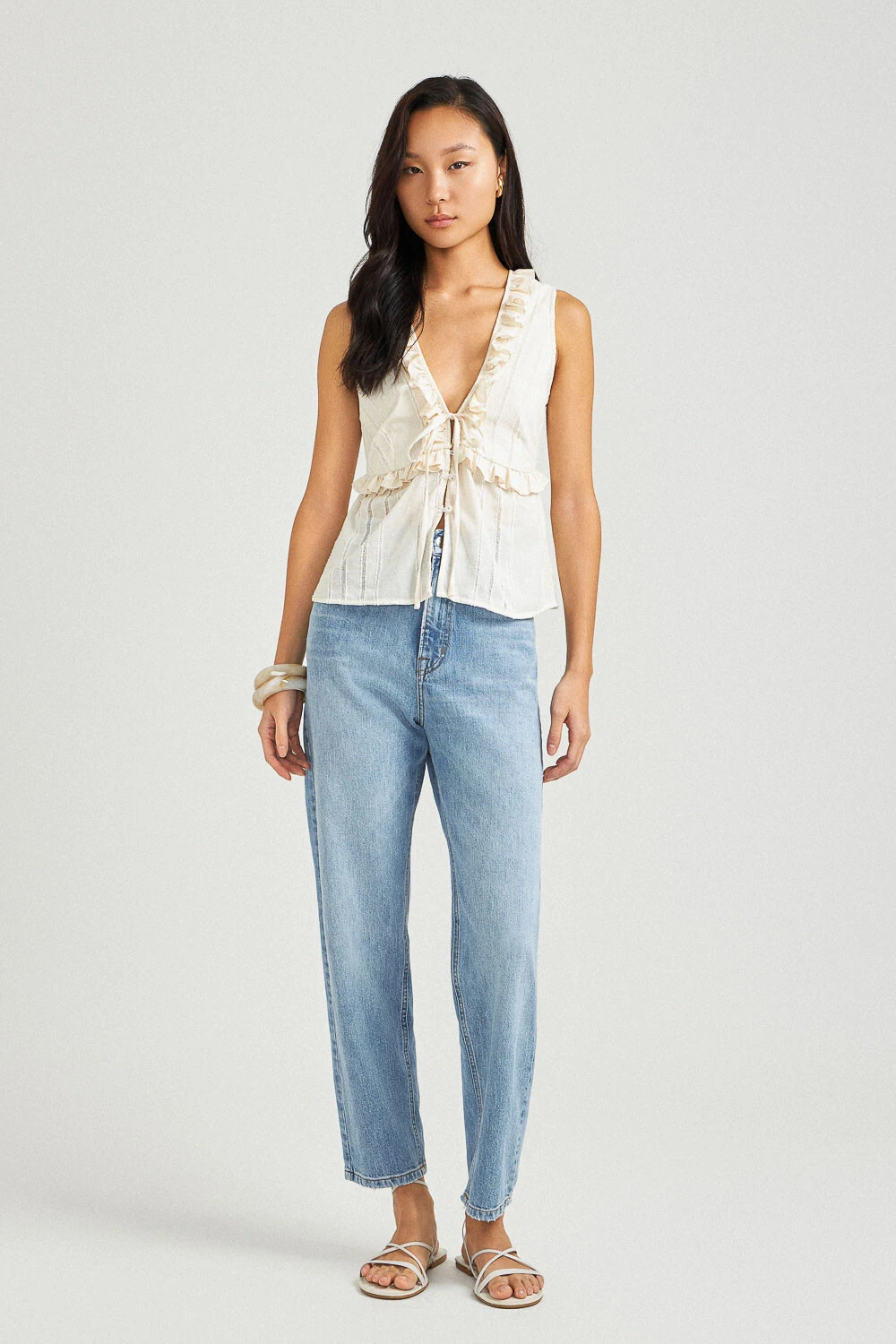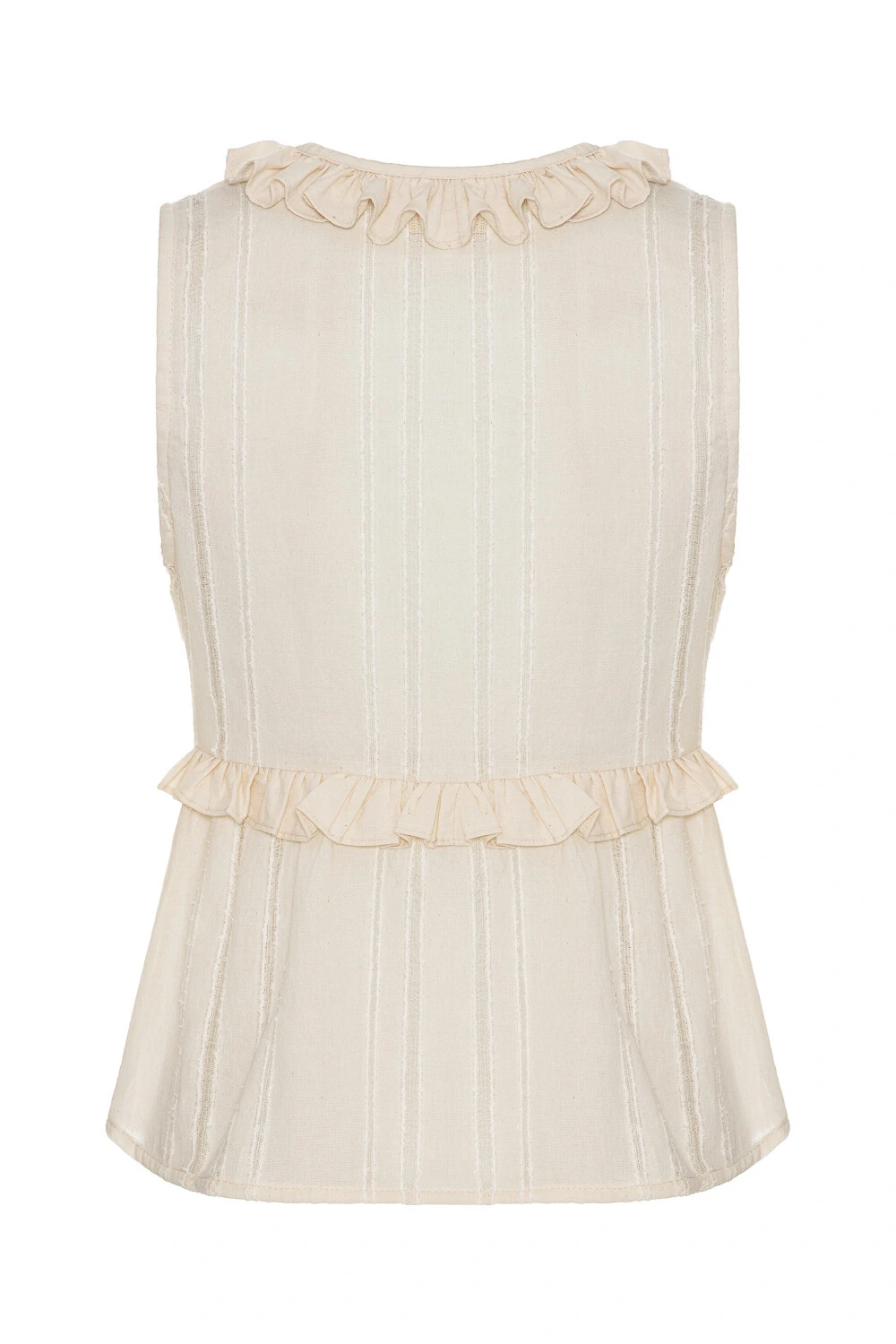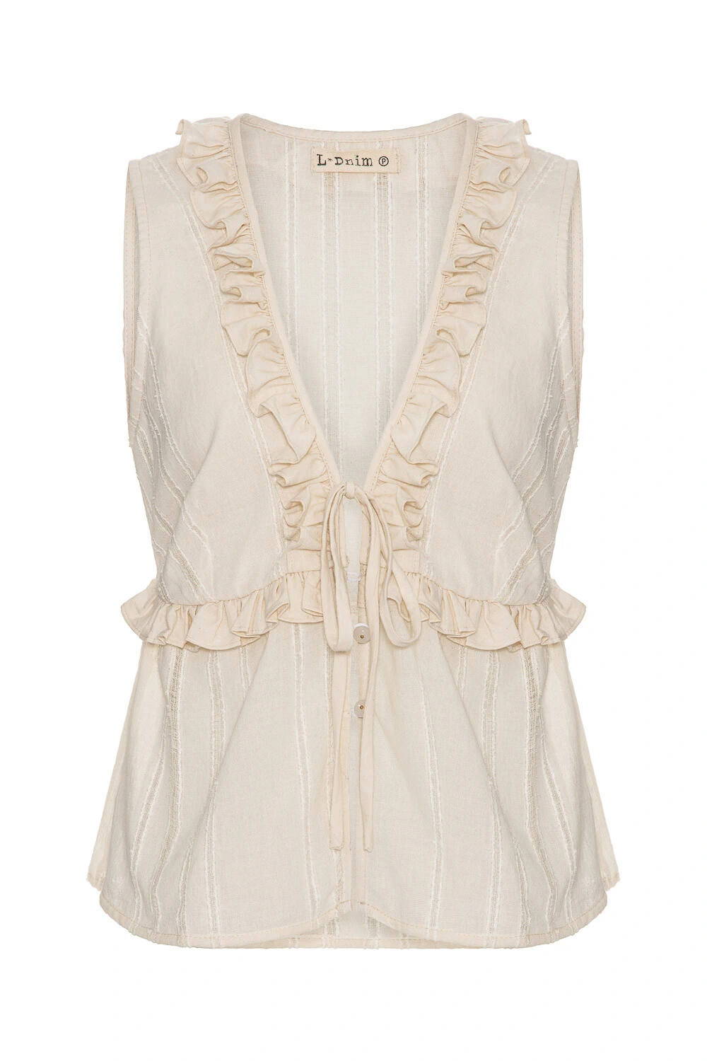 Top em algodão leve com textura de listras, decote V, detalhe de babados e amarração na altura do busto. Feminino e delicado, ideal para looks fresh e elegantes.
