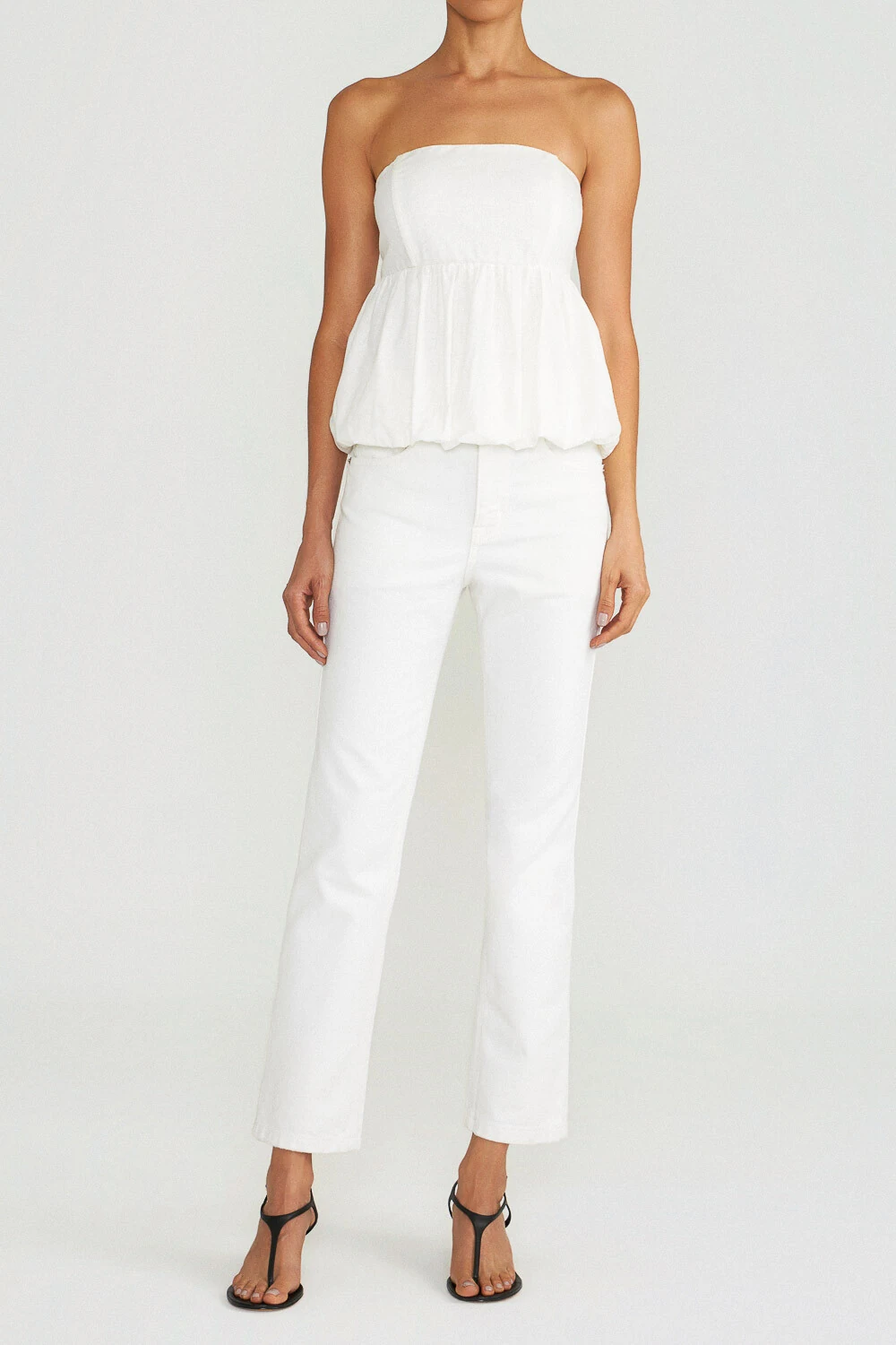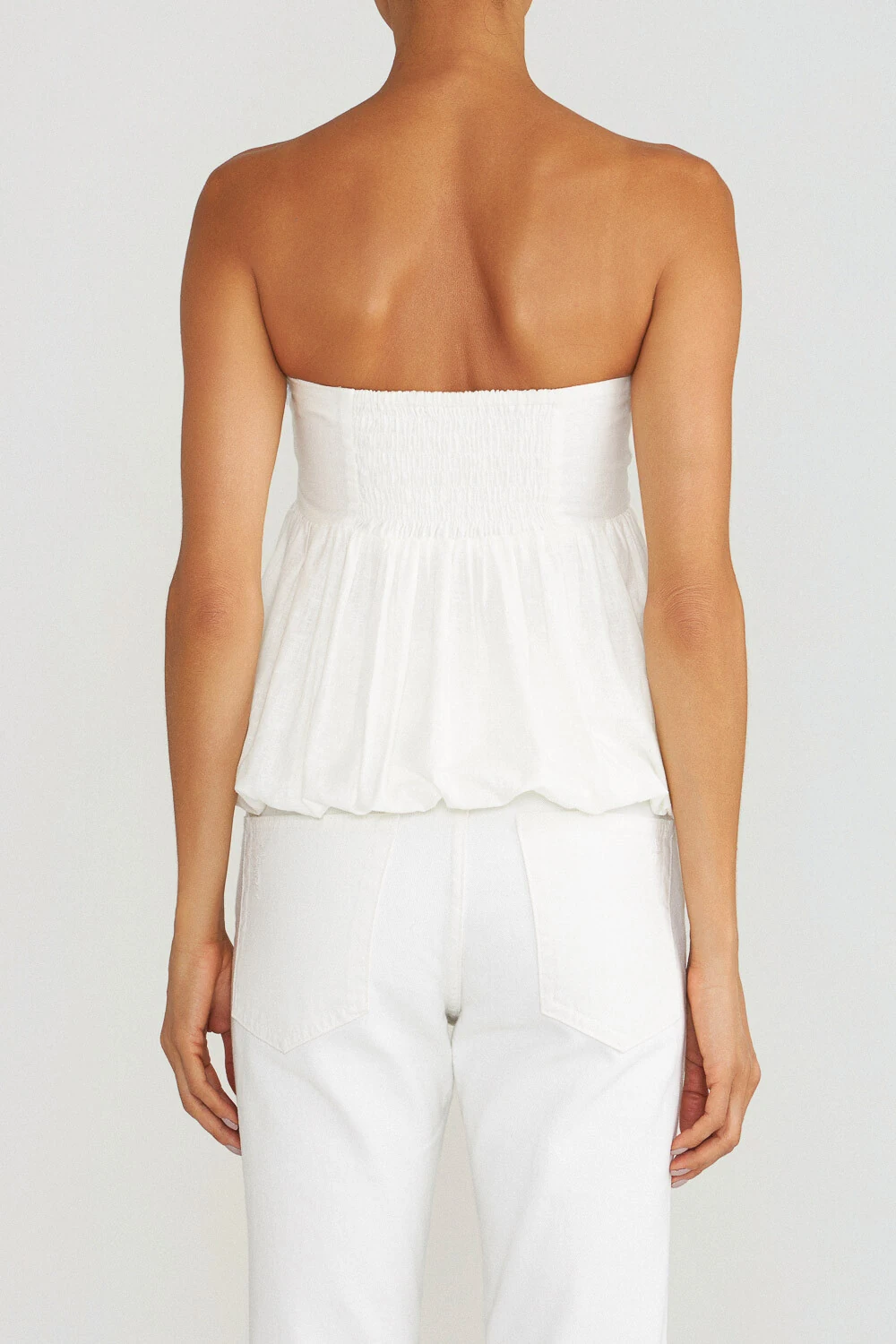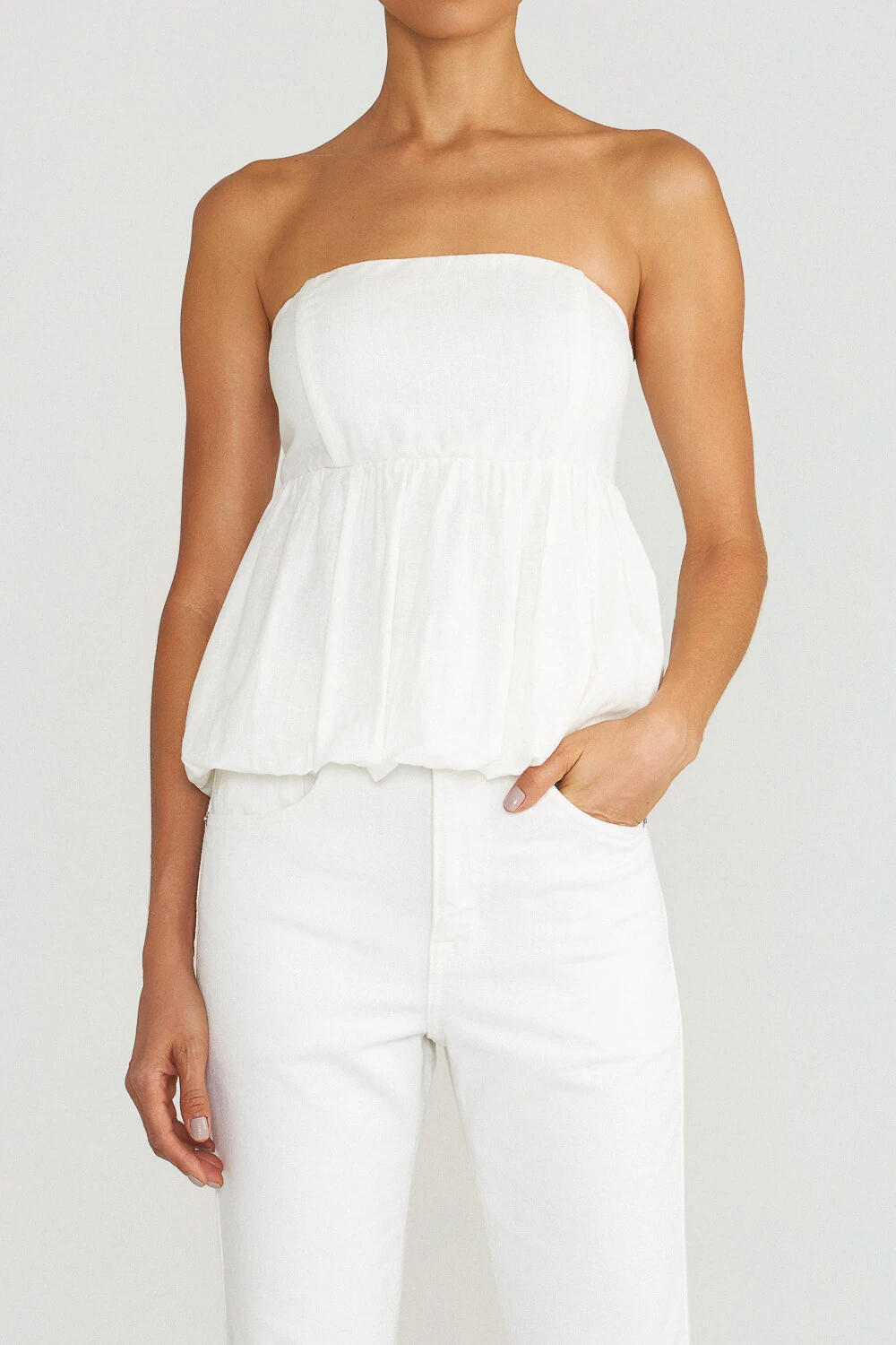 Top tomara que caia em linho com algodão, com modelagem balonê, barbatanas internas e decote reto. Para um melhor ajuste, possui elástico nas costas e fechamento lateral com zíper.