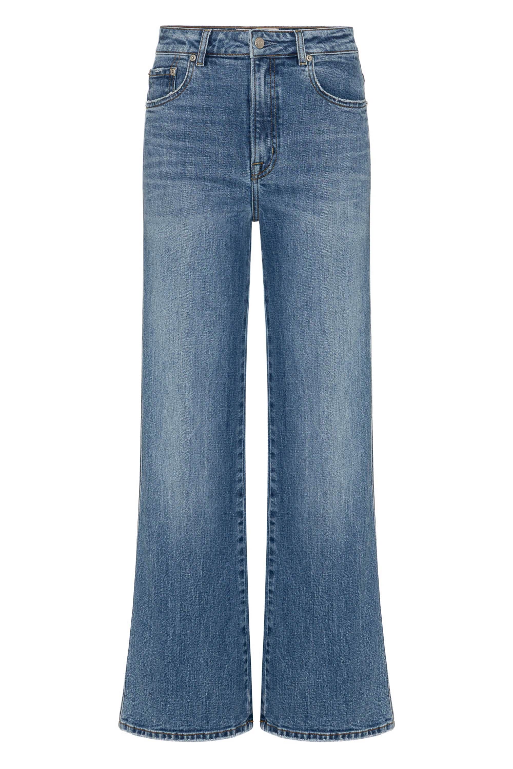 Calça confeccionada em jeans premium com elastano, que oferece estrutura, conforto e liberdade de movimento. A modelagem de cintura média é ajustada no quadril e coxas, abrindo suavemente em “A” ao longo da perna, criando uma silhueta equilibrada e visual alongado. A lavagem vintage em tons de azul traz profundidade e autenticidade à peça. Possui comprimento longo com caimento fluido e fechamento por botão e zíper.