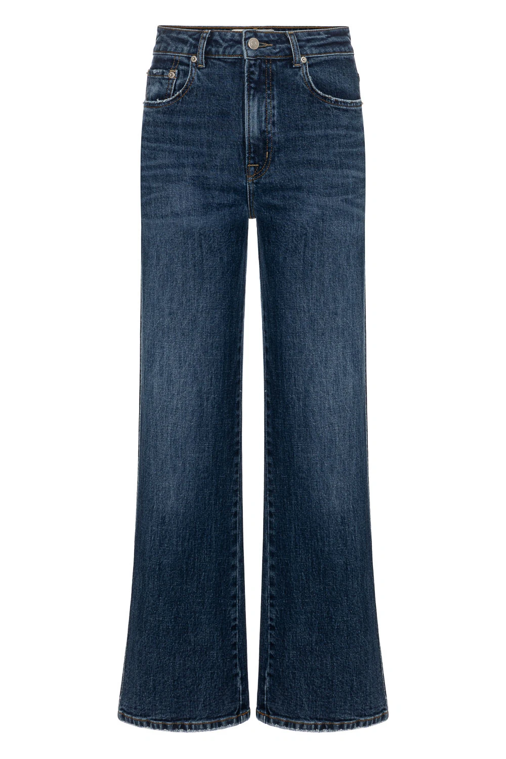 Calça confeccionada em jeans premium com elastano, que oferece estrutura, conforto e liberdade de movimento. A modelagem de cintura média é ajustada no quadril e coxas, abrindo suavemente em “A” ao longo da perna, criando uma silhueta equilibrada e visual alongado. A lavagem vintage em tons de azul traz profundidade e autenticidade à peça. Possui comprimento longo com caimento fluido e fechamento por botão e zíper.