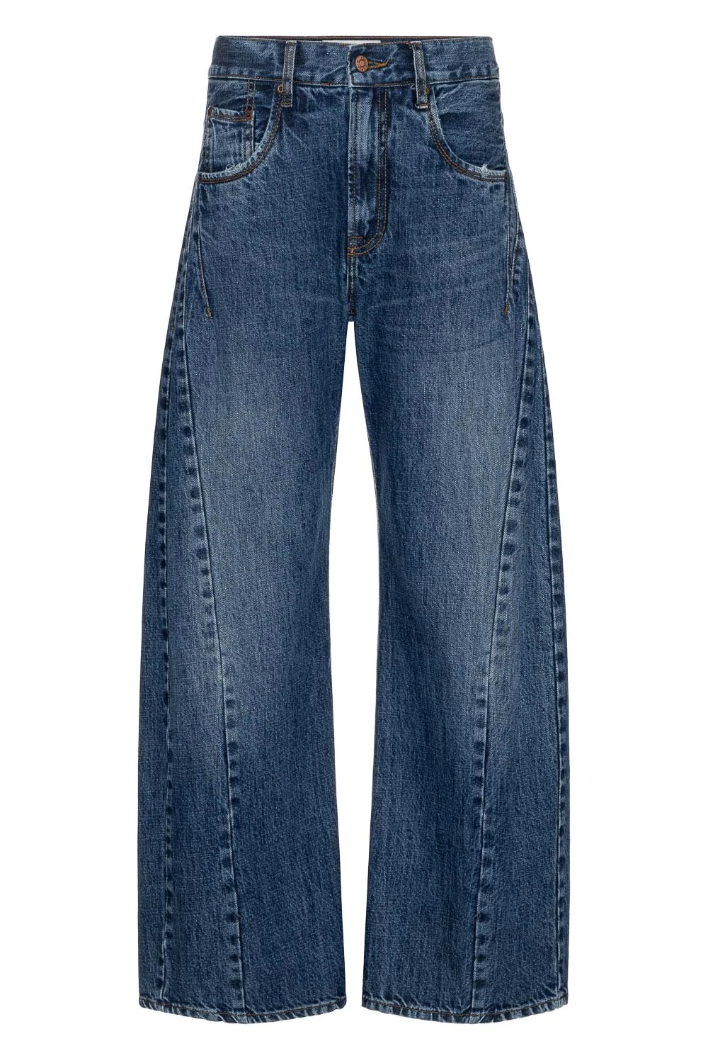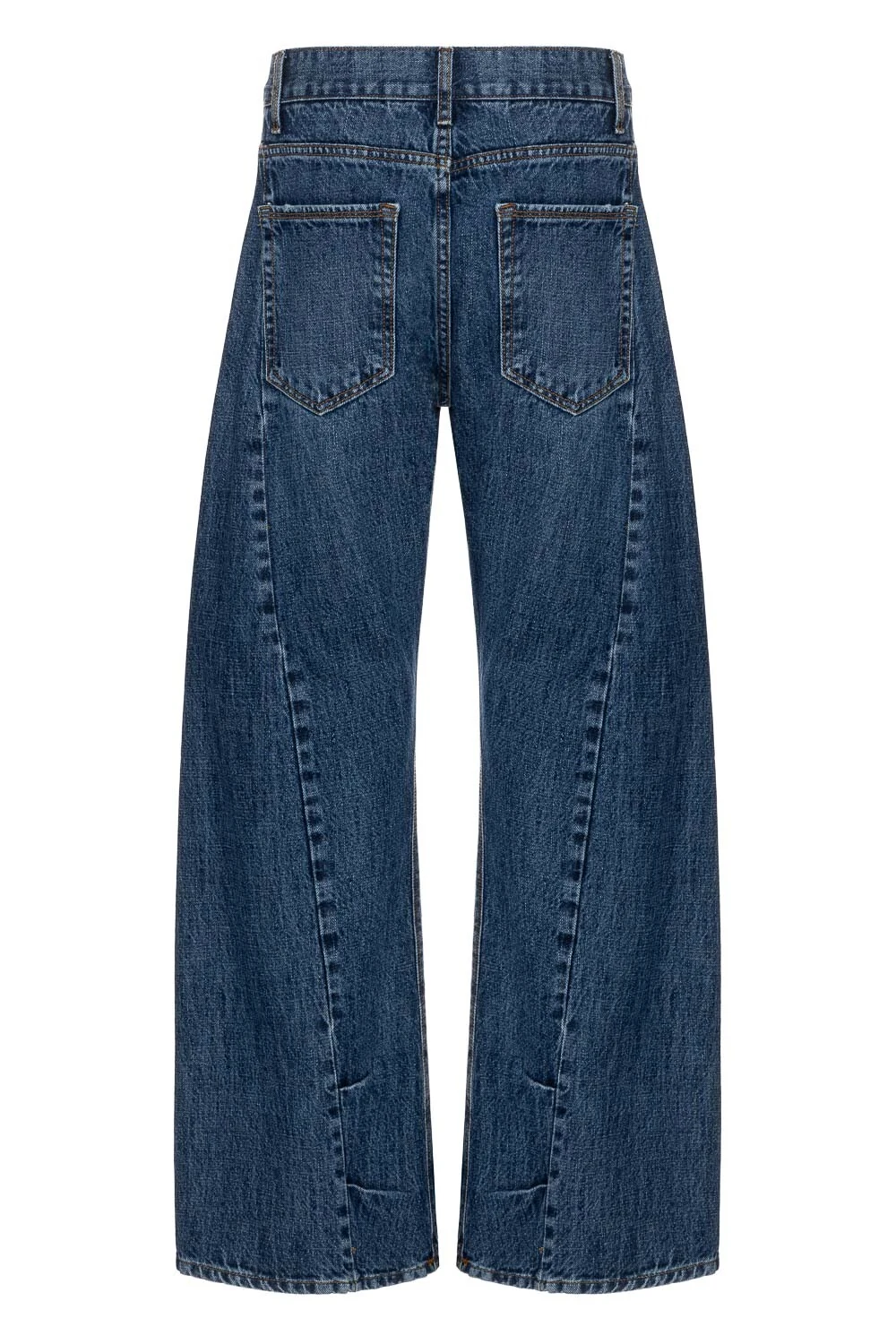 Calça Wide Curve em jeans 100% algodão, com lavagem escura. Possui modelagem curve, com volume nas pernas e leve curvatura que acompanha o corpo, garantindo caimento confortável e atual. Cintura média, detalhe de pregas na altura da barra, criando movimento na base, e pespontos aparentes nas pences do quadril, que valorizam a construção da peça.