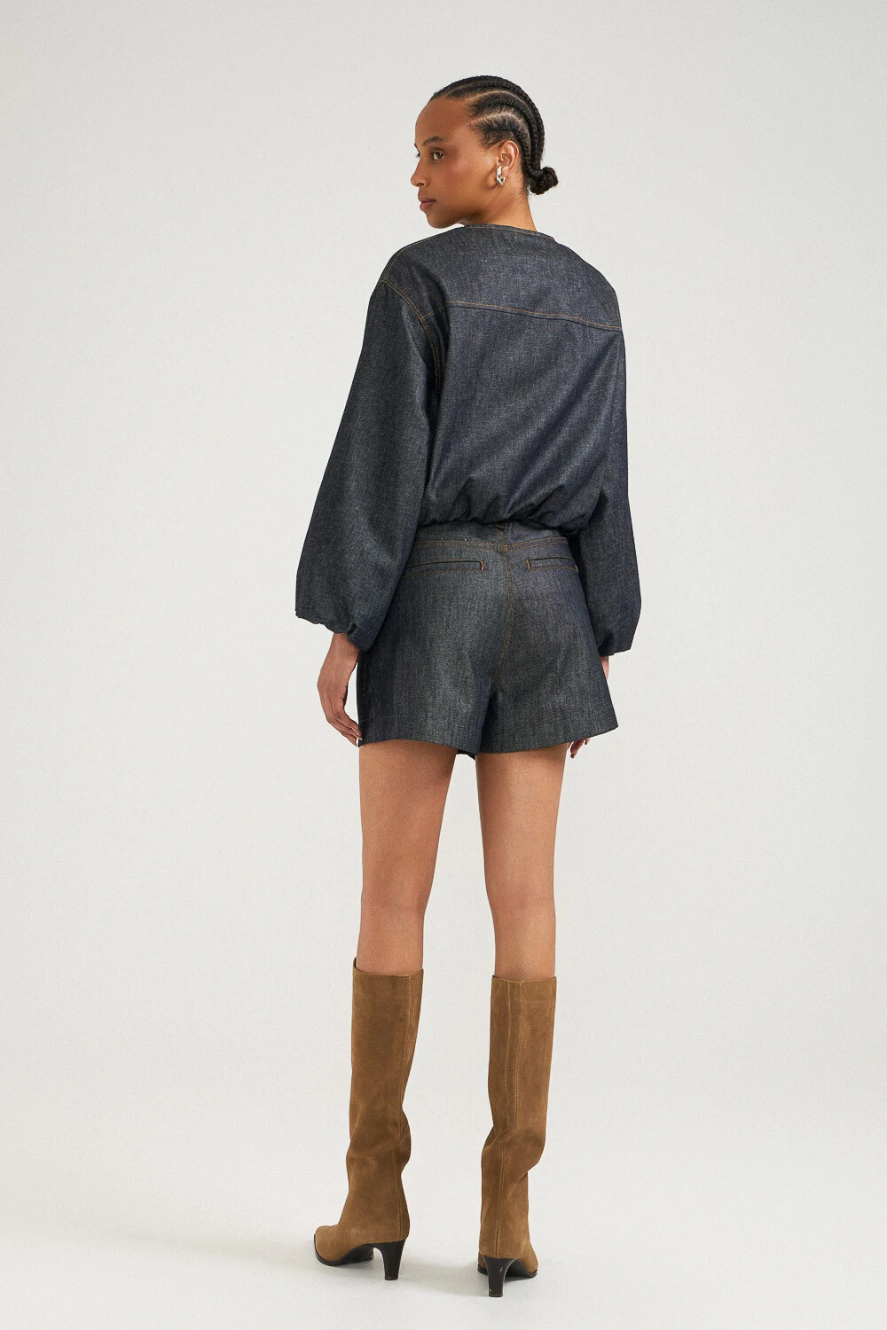 Este short é a representação do encontro entre a autenticidade do denim japonês e a elegância da alfaiataria. Confeccionado em um tecido de estilo Raw Denim, sem processos de lavanderia, ele apresenta um tom profundo e uniforme que preserva a essência clássica do jeans. A modelagem solta ao corpo e o comprimento contemporâneo no meio da coxa garantem liberdade de movimento e um visual moderno e descontraído. O design se destaca pelos detalhes de pregas na frente, que conferem estrutura e sofisticação à peça, enquanto as costuras em contraste reforçam a estética robusta e diferenciada do denim. O fechamento é composto por zíper frontal discreto.