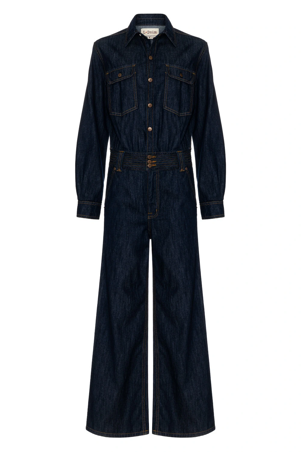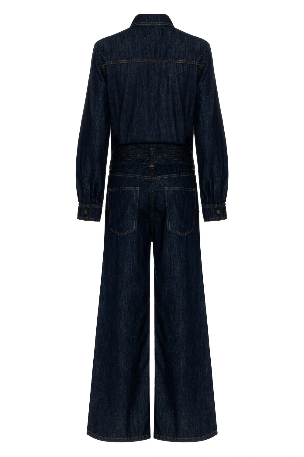 Macacão em denim 100% algodão com lavagem raw (jeans bruto), que valoriza a aparência natural do tecido. Possui mangas longas e fechamento frontal por botões de pressão na vista. Bolsos simétricos, além de cós ajustado com detalhe de pespontos aparentes. A modelagem da calça é ajustada na cintura e quadril, com leve abertura na barra, garantindo equilíbrio entre estrutura e movimento.