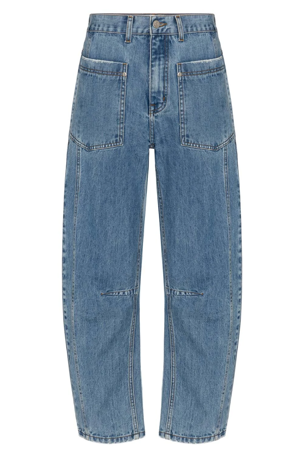 Calça em jeans médio 100% algodão, com visual equilibrado e versátil. Possui cintura média e comprimento curto, ideal para composições atuais. A modelagem apresenta pernas em estilo curve, que acompanham a silhueta com leve volume, enquanto os bolsos chapados frontais adicionam destaque e funcionalidade à peça. Conta com fechamento em botão de metal e zíper.